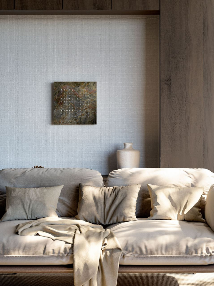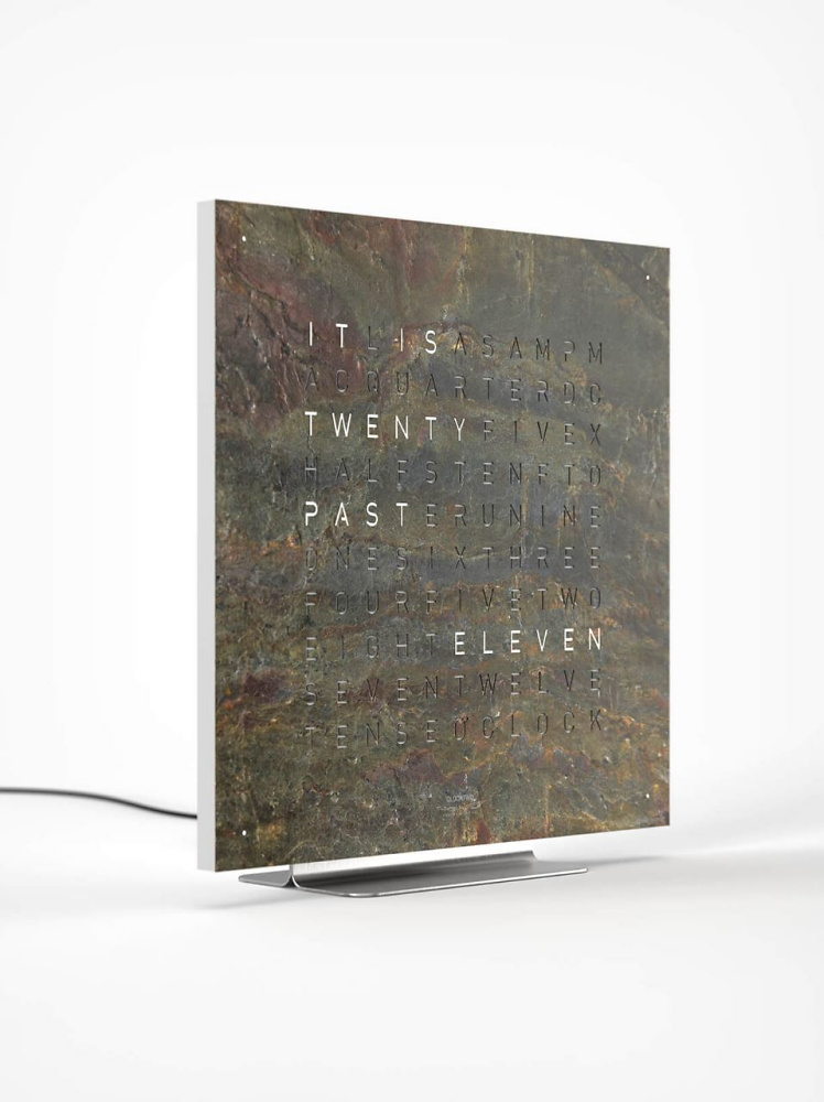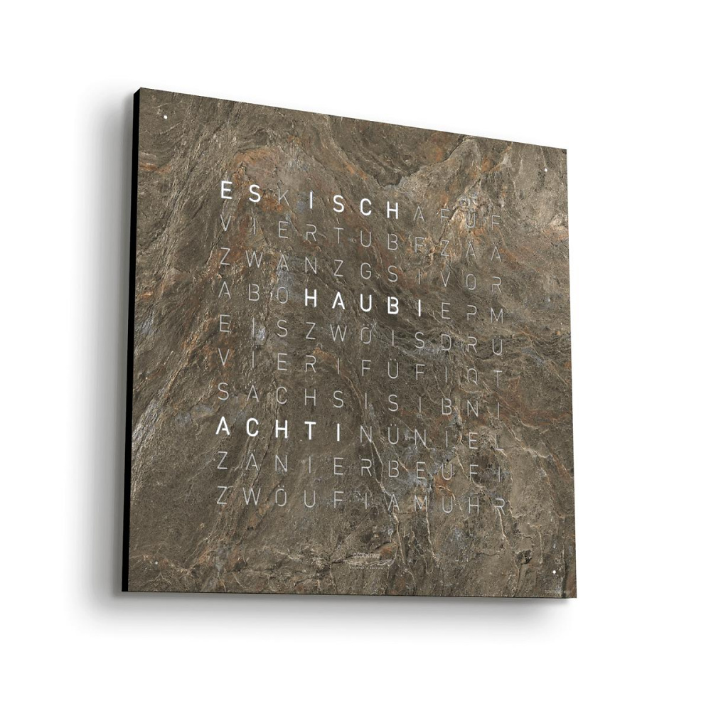 QLOCKTWO EARTH 45 verfügt über ein auswechselbares Frontcover GLINTSCAPE aus Millionen Jahre altem Sedimentgestein. Das Frontcover der QLOCKTWO EARTH 45 wird von Magneten gehalten. Daher kann dieses für einen Farb- oder Sprachwechsel ohne Werkzeug schnell und problemlos ausgewechselt werden: