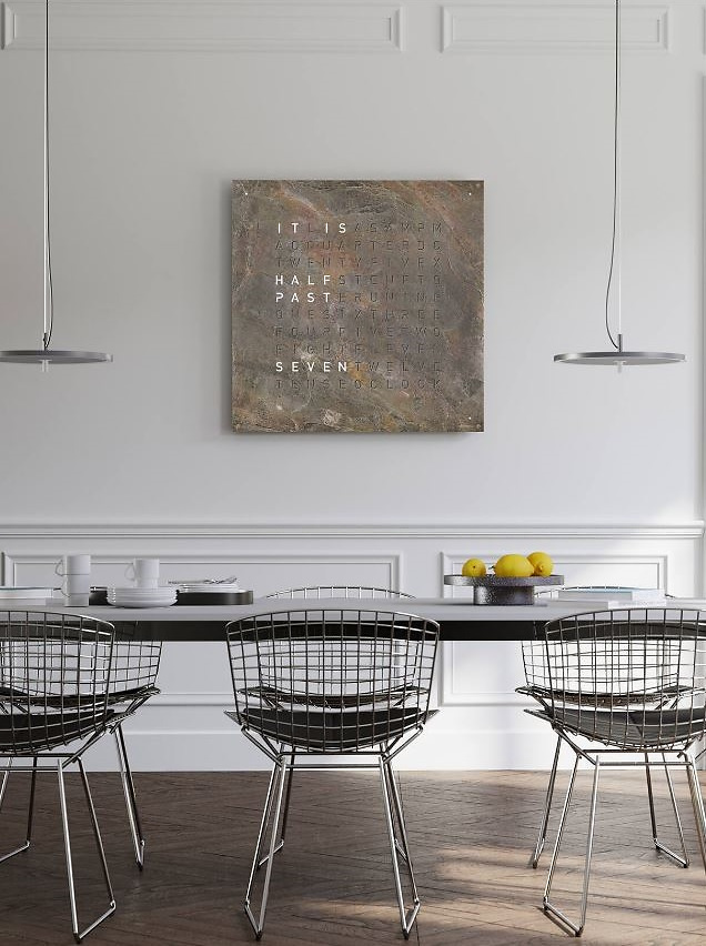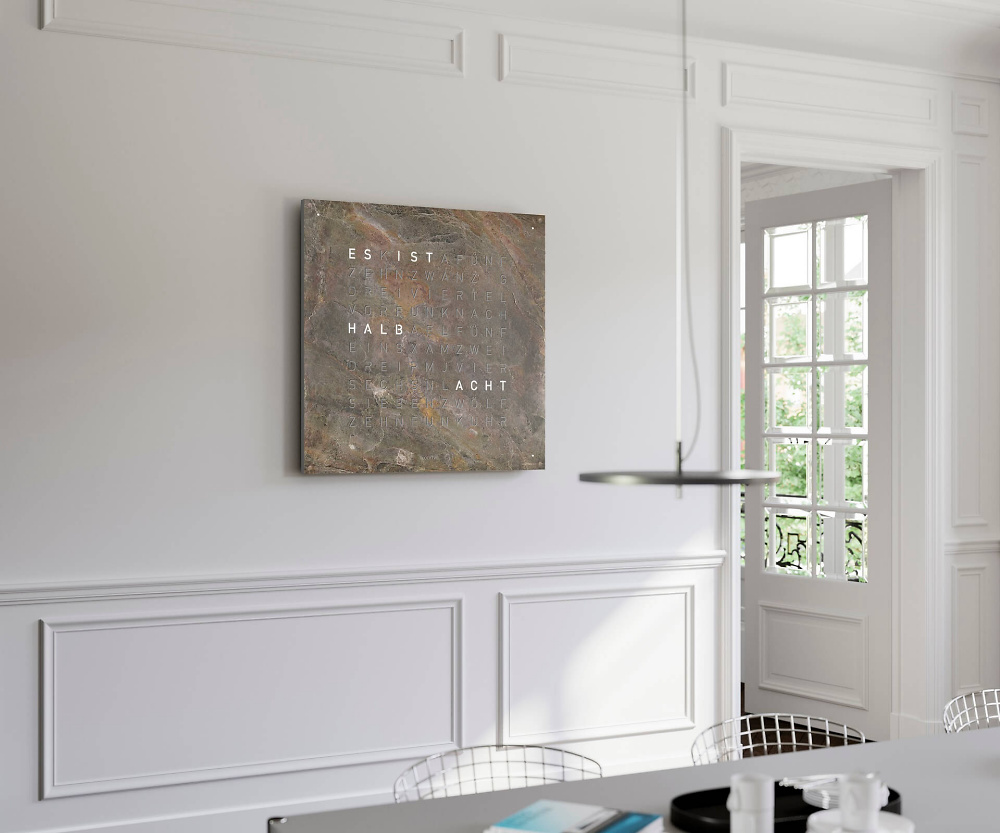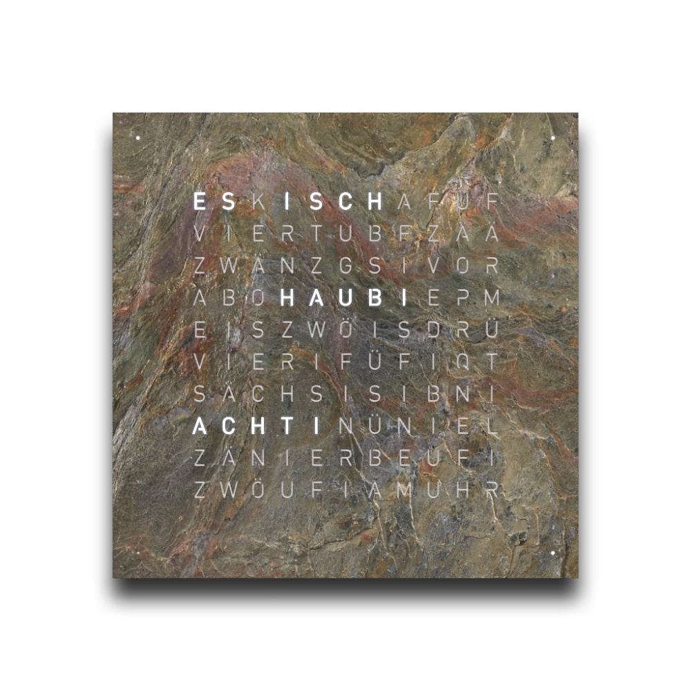 Die 90 x 90 cm grosse EARTH 90 verleiht jedem Raum ein einzigartiges, edles Ambiente. Mittlerweile ist die QLOCKTWO als Wanduhr in 23 Sprachen erhältlich. Besonders stolz sind wir natürlich auf die Variante in Schweizerdeutsch (Berndeutsch), die auf unser Hinwirken realisiert wurde.
