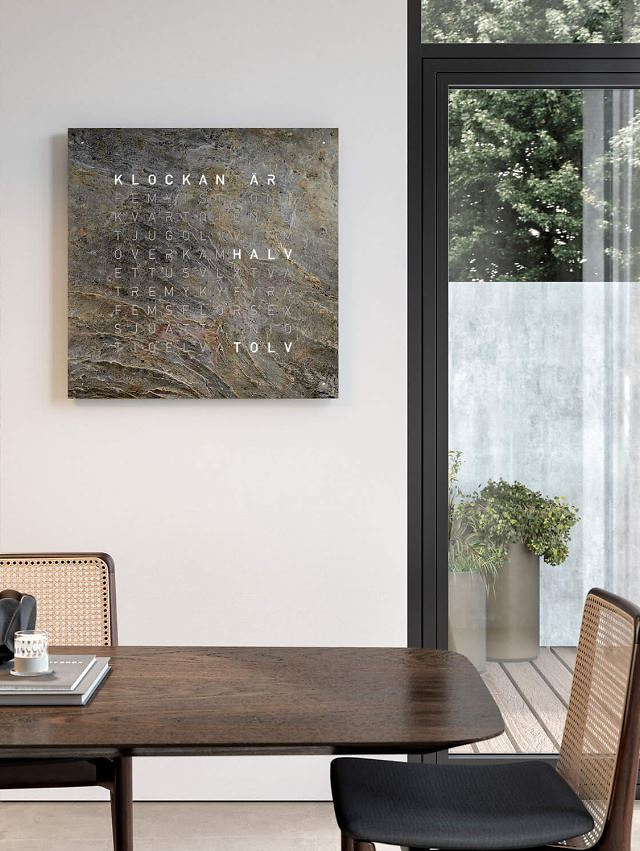 OHNE ZEIGER. OHNE ZIFFERN.Die QLOCKTWO EARTH ist eine Hommage an das einzigartige Kulturgut Zeit und unseren Planeten. Sie zeigt die 24 Stunden eines Tages auf einer Wortmatrix in den Sprachen unserer Welt an. QLOCKTWO EARTH 90 CREATOR'S EDITION GLINTSCAPE fasziniert mit dem auswechselbaren Frontcover aus Millionen Jahre altem Sedimentgestein. Die einzigartigen Reliefes aus zufälligen Unebenheiten und einer perlmutt-schimmernden Oberfläche erinnert an eine Herbstlandschaft, die sich in einem funkelnden See mit seinen lieblichen Tönen in Grün, Rot und Gold spiegelt. Der edle Naturstein geht mit der poetischen Zeitanzeige eine aussergewöhnliche Verbindung ein und schafft so ein einzigartiges Kunstobjekt, das in einem aufwendigen Druckverfahren signiert und einzeln nummeriert wird. Wie auch bei den anderen Modellen der CREATOR’S EDITION werden die Buchstaben zur Anzeige der Zeit aus dem Material herausgearbeitet.