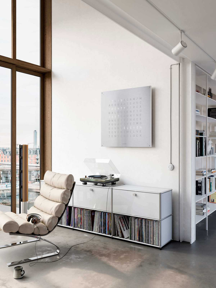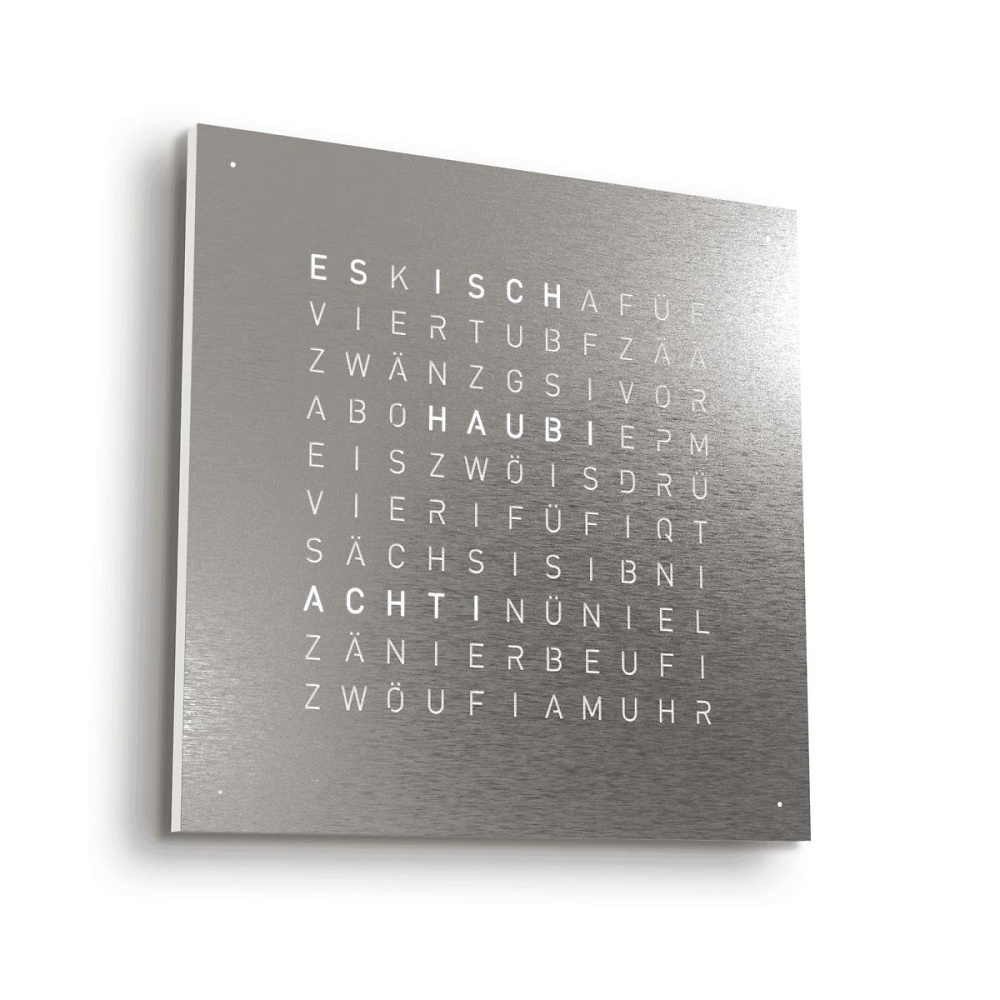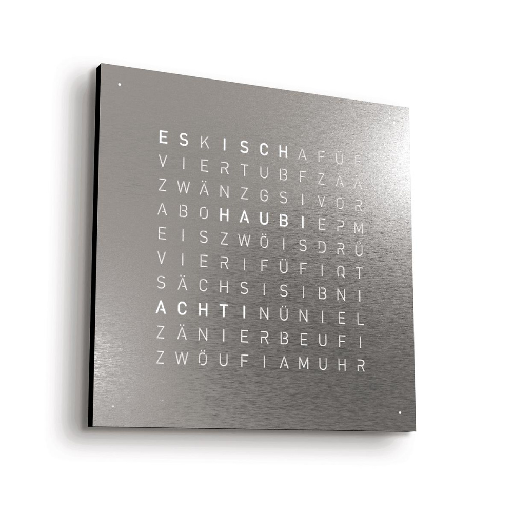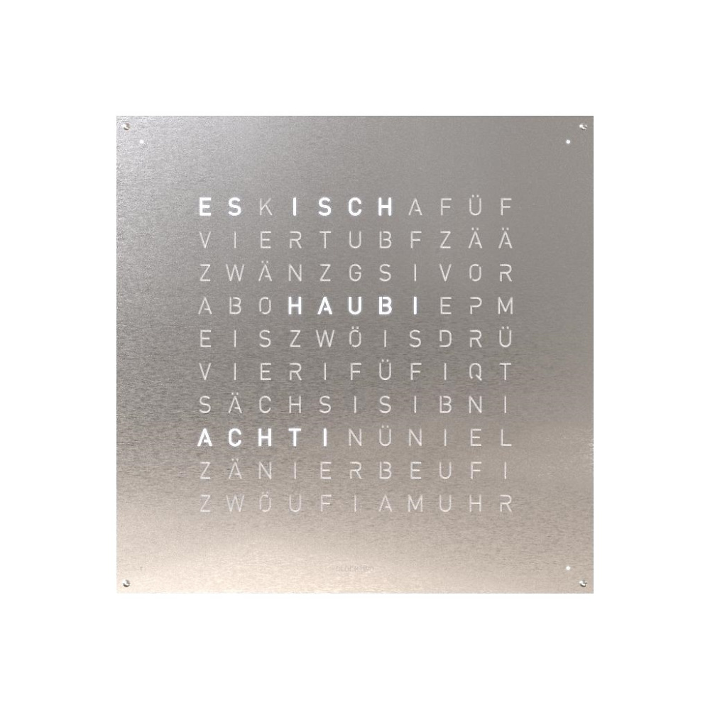STAINLESS STEEL in einen einzigartigen Dialog. Denn mit ihrer vermeintlich kühlen Optik nimmt sie durch Lichtreflexe die Farbigkeit und Wärme der Umgebung auf und verschmilzt mit ihr.Die 90 x 90 cm grosse EARTH 90 verleiht jedem Raum ein einzigartiges, edles Ambiente. Mittlerweile ist die QLOCKTWO als Wanduhr in 23 Sprachen erhältlich. Besonders stolz sind wir natürlich auf die Variante in Schweizerdeutsch (Berndeutsch), die auf unser Hinwirken realisiert wurde.