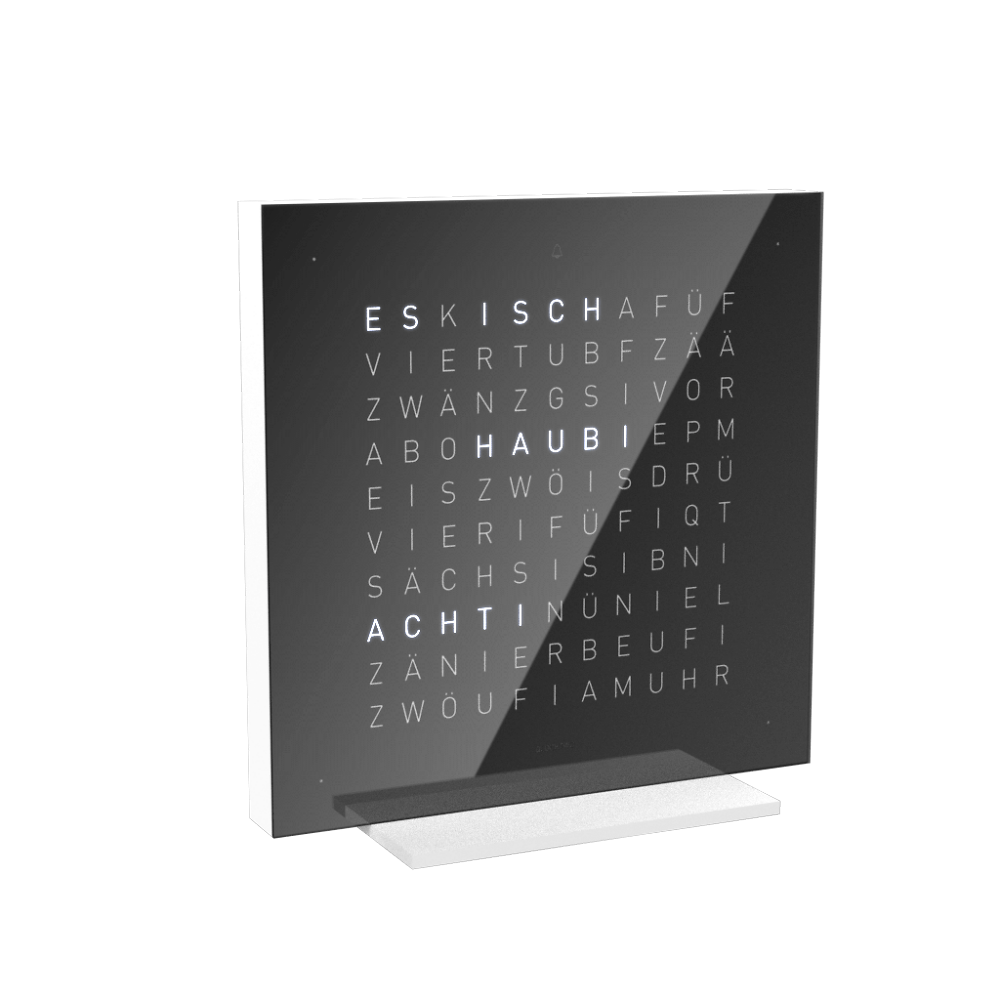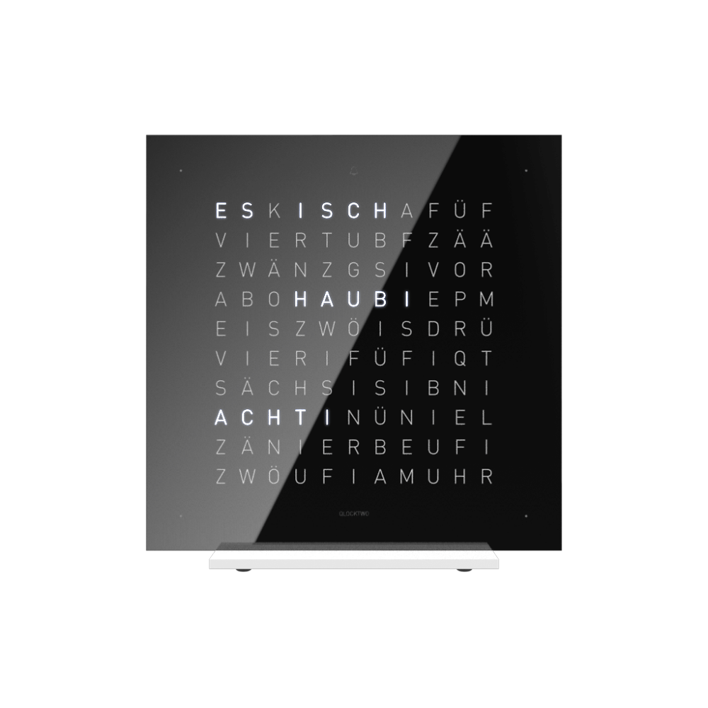 Dies erlaubt es Ihnen, der Uhr jederzeit ein neues Gesicht zu verpassen, da die Frontabdeckungen separat erworben werden können (einzige Ausnahme ist die Front in arabischer Sprache). Damit ist sichergestellt, dass die Uhr auch noch in 10 Jahren mit Ihrem Interieur harmoniert und letztlich wahrhaftig zeitlos wird. Mittlerweile ist die Qlocktwo als Wanduhr in 23 Sprachen erhältlich. Besonders stolz sind wir natürlich auf die Variante in Schweizerdeutsch (Berndeutsch), die auf unser Hinwirken realisiert wurde. Achtung: Der im Lieferumfang enthaltene Acryl Standfuss kann für diese Ausführung nicht verwendet werden, da er die behandelte Oberfläche der Front beschädigen könnte.