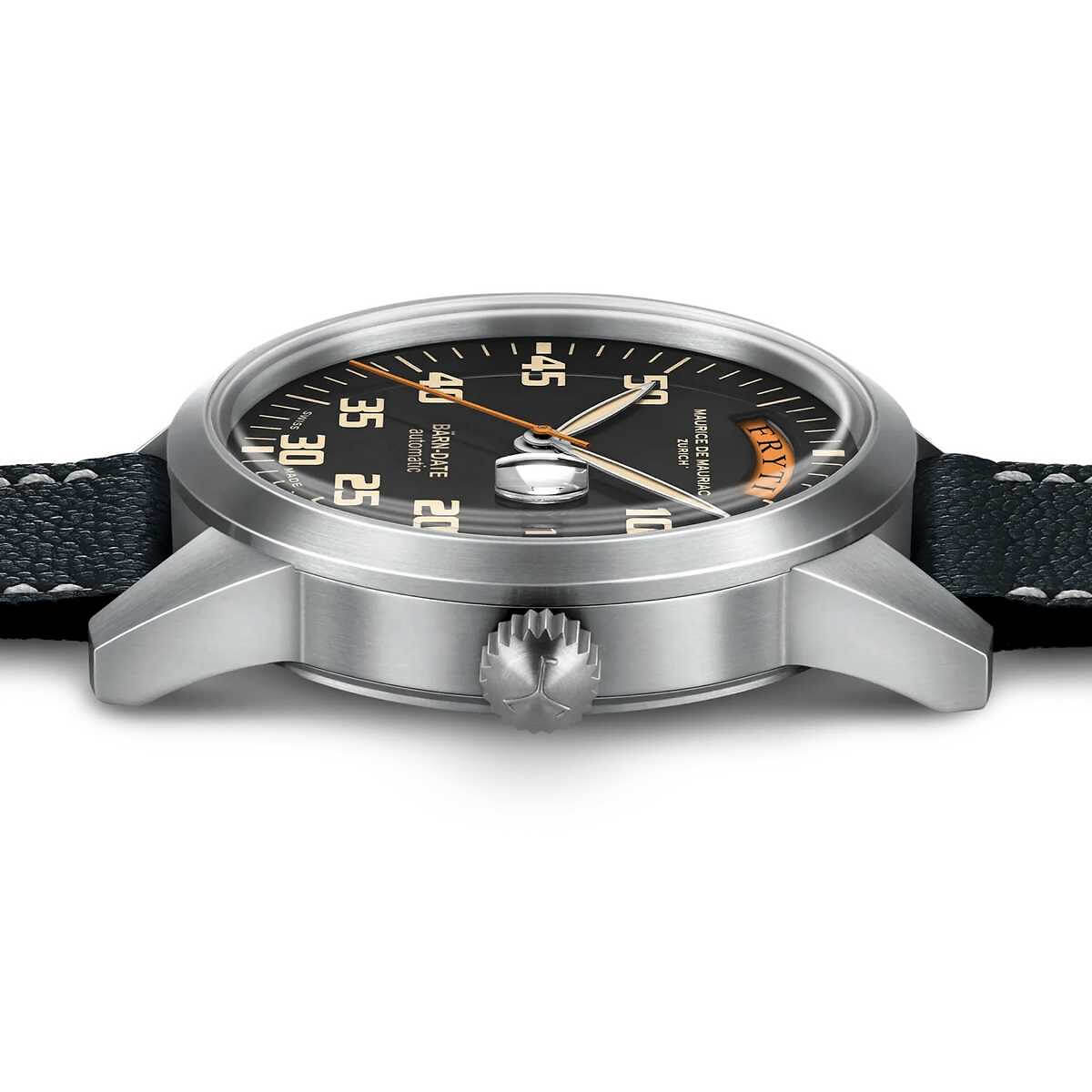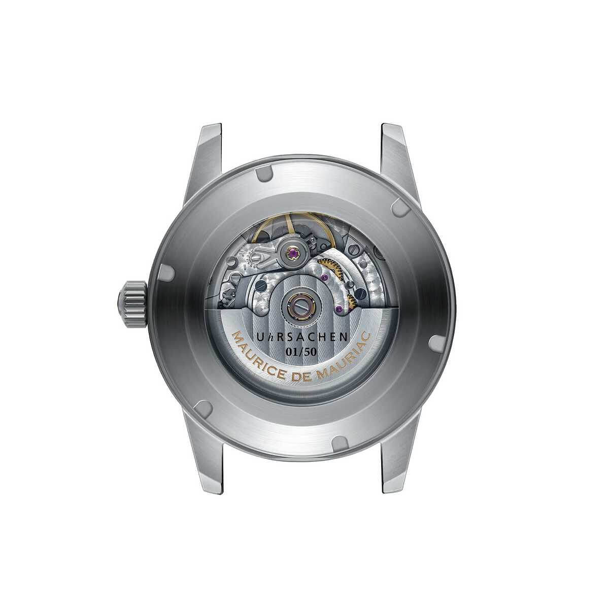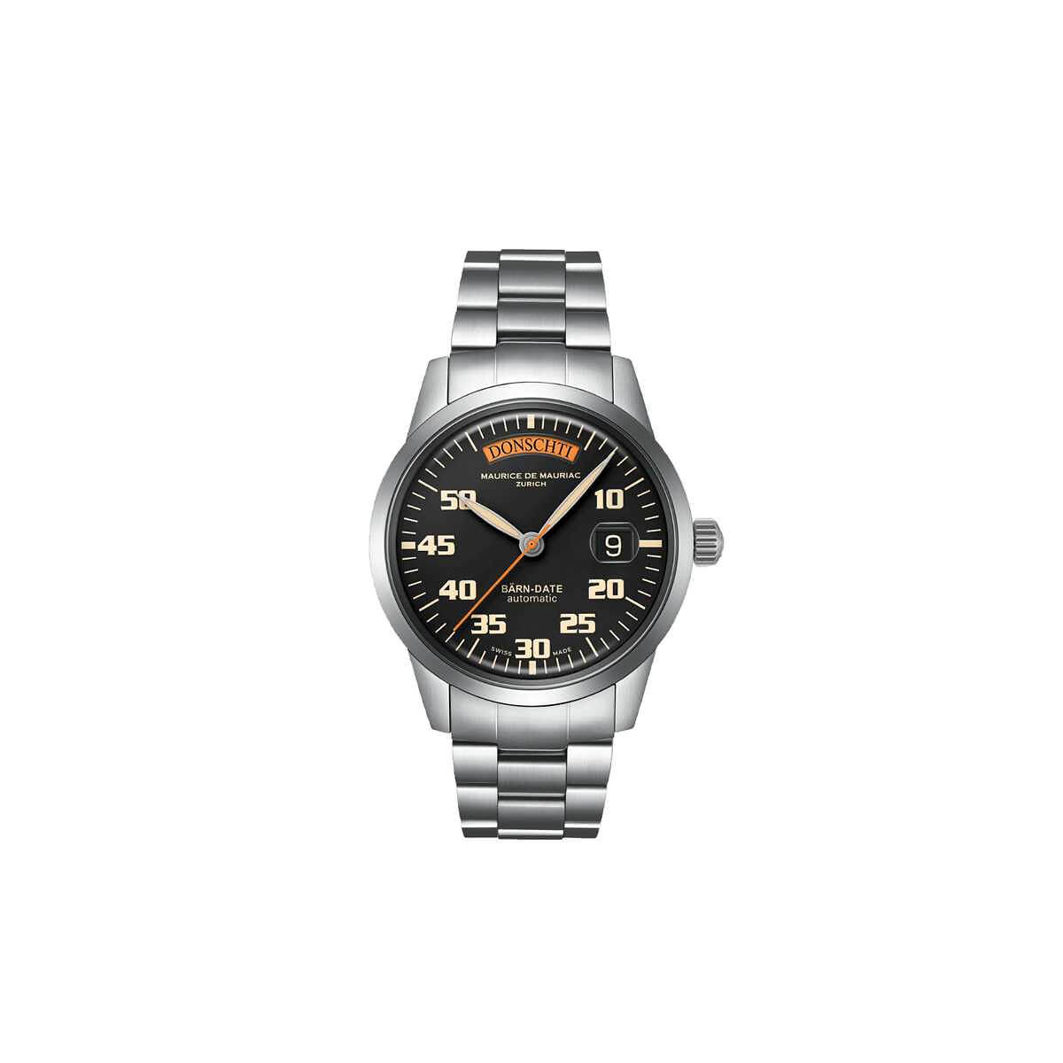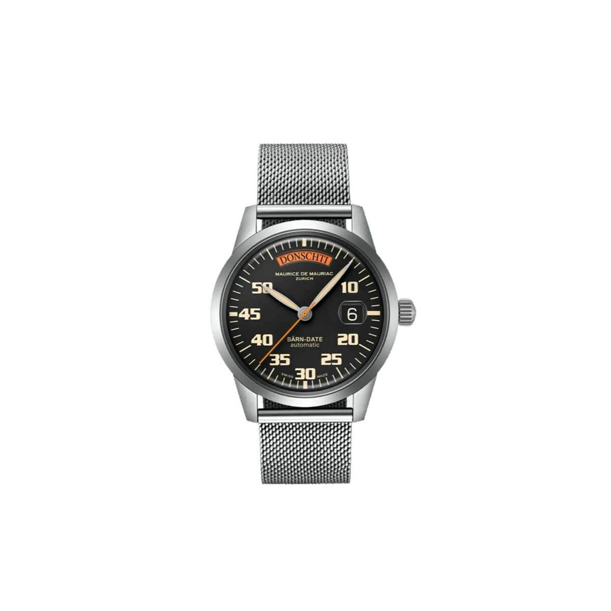 Marke MAURICE DE MAURIAC Modell BÄRN-DATE: Uhrsachen Edition - Limitiert auf 50 Exemplare Referenz MDM.130.BärnDate.UR Dimensionen 39mm Materialien Gehäuse aus satiniertem Edelstahl, schwarzes Zifferblatt mit Sekundenzeiger und Wochentags-Anzeige in UhRSACHEN-Orange, geschützt durch ein blau entspiegeltes Saphirglas, Saphirglas-Sichtboden. Folgende Armbandmöglichkeiten stehen zur Auswahl: Lederband mit Dornschliesse aus Edelstahl, Edelstahl-Milanaiseband mit Sicherheitsschliesse oder Edelstahlband mit Drückerfaltschliesse. Uhrwerk Mechanisches Uhrwerk, ETA-Kaliber 2834 mit automatischem Aufzug Funktionen Anzeige der Stunden, Minuten und Sekunden inkl. Wochentags- und