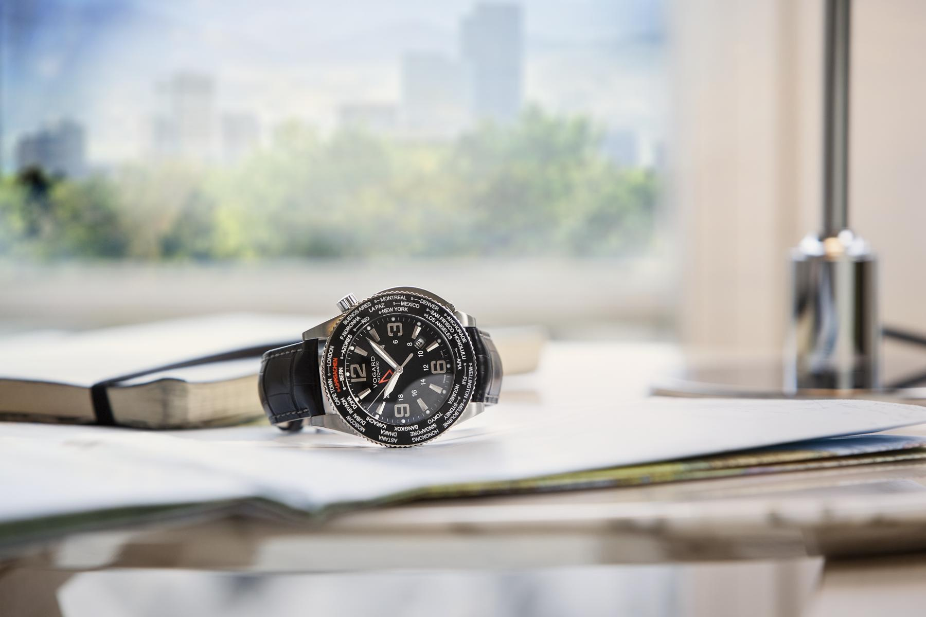 Vogard war der Spezialist für Weltzeituhren und die einzige Marke überhaupt, die sich ausschliesslich mit den Zeitzonen beschäftigte. Diese werden mit dem von Vogard patentierten Einstellmechanismus direkt über die Lunette eingestellt. Es liegt nahe, dass bei der Sonderedition für die Kennzeichnung des «Längengrades +1» nicht etwa Paris oder Berlin steht, sondern Uhrsachen und Bern. Doch damit hört die Individualisierung nicht auf. Das Zifferblatt und der 24-Stundenzeiger wurden in den Hausfarben Schwarz und Orange gestaltet. Auch die Komposition der weiteren Komponenten ist ausschliesslich in dieser Sonderedition erhältlich. Es gibt zwei unterschiedliche Versionen, welche auf je 10 Stück limitiert sind. Die eine mit einem matten Stahlgehäuse und einem schlichten schwarzen Zifferblatt, die andere mit einem PVD beschichteten schwarzen Gehäuse und einem Zifferblatt aus massivem Karbon. Beide Varianten werden von einem mechanischen Uhrwerk mit automatischem Aufzug angetrieben, welches in den Ateliers von Vogard zur perfekten Weltzeituhr getrimmt worden ist.