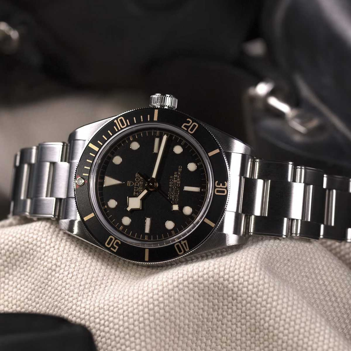 Mit einer Wasserdichtigkeit von 200 Metern sowie verschraubter Krone erfüllt die 39 Millimeter Tudor Black Bay die Anforderungen einer robusten Sportuhr. Optisch bleibt das Modell der Black Bay Linie treu: ein schwarzes Zifferblatt mit klaren Indizes, charakteristischen „Snowflake“-Zeigern und warmen, goldfarbenen Akzenten sorgt für eine sehr gute Ablesbarkeit und eine ausgewogene, klassische Anmutung. Die einseitig drehbare Lünette mit Aluminium-Inlay ergänzt das funktionale Gesamtbild. Im Inneren arbeitet das Manufakturkaliber MT5402 mit rund 70 Stunden Gangreserve und Chronometer-Zertifizierung. Es steht für präzise und zuverlässige Leistung.