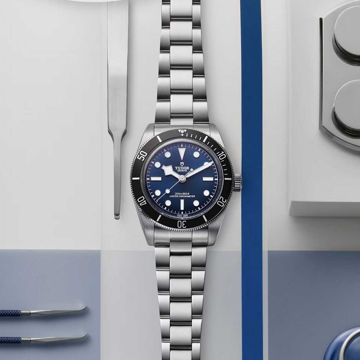 Marke TUDOR Modell Black Bay 68 Referenz M7943A1A0NU-0001 Dimensionen 43mm Materialien Gehäuse und einseitig drehbare Lünette aus Edelstahl mit mattschwarz eloxiertem Inlay aus Aluminium, TUDOR-blaues Zifferblatt, geschützt durch ein Saphirglas, begleitet von einem dreireihigen Uhrband aus Edelstahl mit Sicherheitsfaltschliesse aus Edelstahl Kaliber Mechanisches Manufakturwerk mit COSC- und METAS- zertifiziertem Manufakturkaliber MT5601-U mit automatischem Aufzug Funktionen Anzeige der Stunden, Minuten und Sekunden