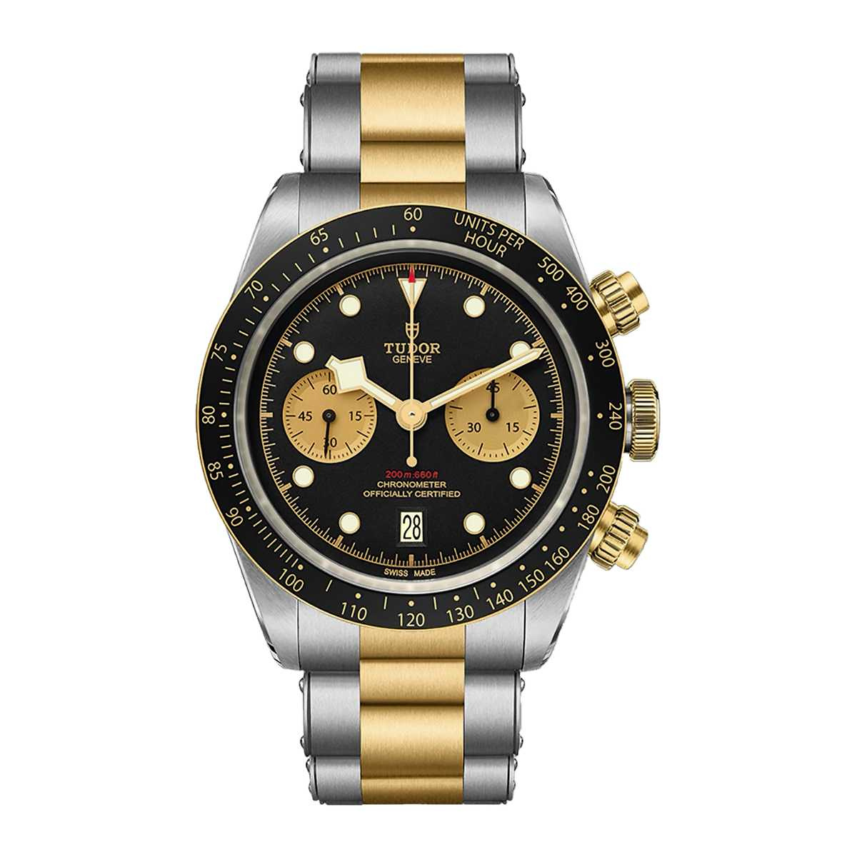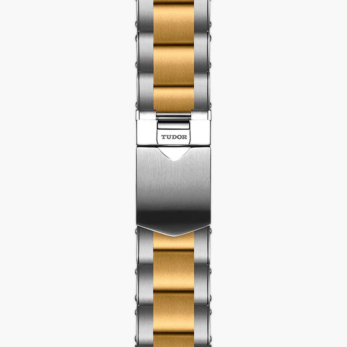 Materialien Gehäuse aus Edelstahl mit Lünette und Drücker aus massivem Gelbgold mit goldfarbener Tachymeterskala auf dem mattschwarz eloxiertem Inlay aus Aluminium, schwarzes Zifferblatt, geschützt durch ein Saphirglas, begleitet von einem dreireihigen Uhrband aus Edelstahl und Gelbgold (erstes Bandglied am Gehäuse aus massivem Gelbgold, restliche Gold-Cap) mit TUDOR „T‑fit“-Sicherheits­-Faltschliesse und Schnellverstellsystem aus Edelstahl